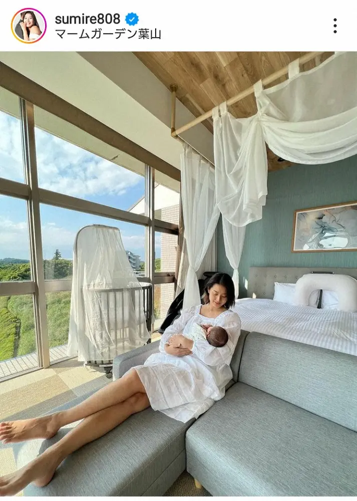 タレントのすみれ(31)が30日、自身のインスタグラムを更新。4月に出産した第1子男児とともに産後ケアホテルでくつろぐ姿を披露した。