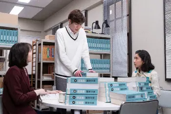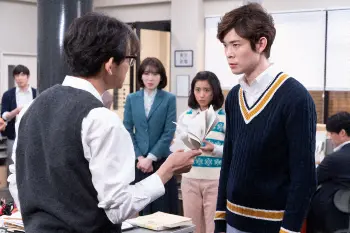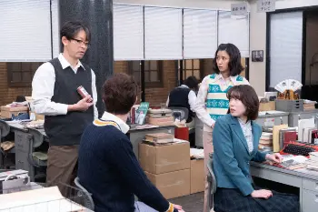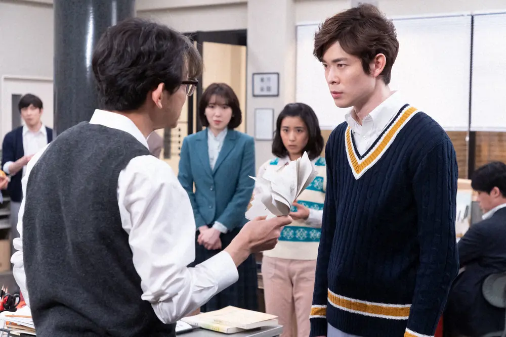 連続テレビ小説「ちむどんどん」第39話。新聞社にて。田良島(山中崇)に記事に大きな問題を指摘される和彦(宮沢氷魚)。左から田良島、愛(飯豊まりえ)、暢子(黒島結菜)、和彦(C)NHK