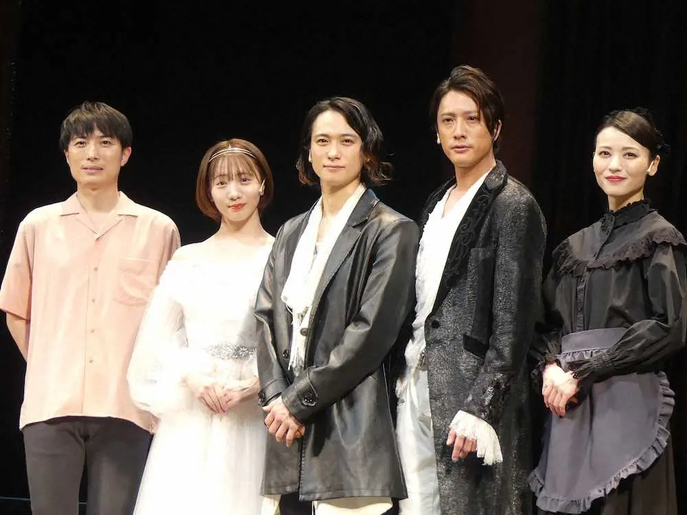 舞台「フォーティンブラス」の取材会に出席した(左から)中屋敷法仁氏、能條愛未、戸塚祥太、内博貴、矢島舞美(撮影・糸賀日向子)
