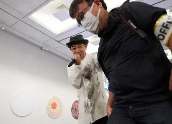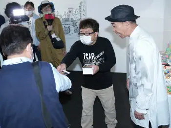 また、「見に来て欲しい人は」との質問の回答中には、「もう1人来てます」と言って、オフィシャルカメラマンの男性を自身の隣に呼び寄せた。男性はマスクを外させると、木梨は「野猿の半田です」と紹介。90年代にとんねるずの番組企画で結成されたユニット「野猿」で一緒に活動した、ゴテこと半田一道さん(58)だった。半田さんは「非常に感動してます」と個展の感想を語ると、木梨は笑いながらマイクでどついた。