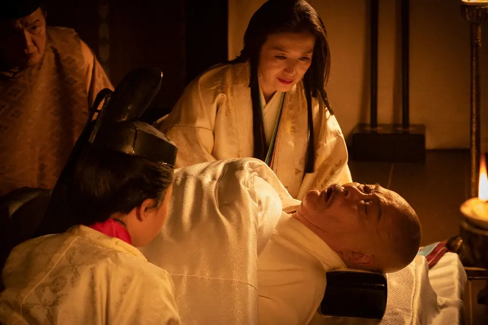 大河ドラマ「鎌倉殿の13人」第22話。丹後局(鈴木京香・奥)と後鳥羽天皇(菊井りひと・手前)に“遺言”を残す後白河法皇(西田敏行)(C)NHK