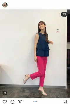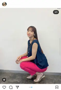 「このパンツは、シワにならないし、ジャージかと思うくらいグイングイン伸びるのに形キレイだから気に入ってます」と記し、美脚ぶりが良く分かる写真を複数のポーズで決めてみせた。