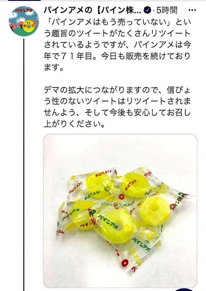 というのも、「パインアメがもう売ってない」というツイートがリツイートされるなどし、デマが拡散。この事態を受け、パインアメを製造する菓子メーカー「パイン株式会社」の公式アカウント(@pain_ame)が「『パインアメはもう売っていない』という趣旨のツイートがたくさんリツイートされているようですが、パインアメは今年で71年目。今日も販売を続けております」とパインアメの画像付きでデマを否定した。
