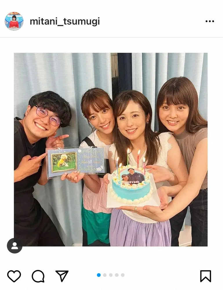 三谷アナ、久慈、日本テレビの佐藤梨那アナ、フジテレビの黒瀬翔生アナの4ショットなどを投稿。「黒瀬宅にみんなで集まってサプライズ!の予定が…私とさとりなが鈍臭すぎて 写真ケーキをスムーズに出せずそれでも『泣きそう!』と喜んでくれました」と黒瀬アナ宅でのお祝いの様子をアップ。「この日は足袋さんもお家にお邪魔したのですが ずっと久慈子の膝の上にいました この得意気な顔 笑」と自身の愛犬が久慈アナに抱かれる愛らしいショットも公開した。