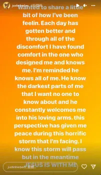ストーリーズには心境をつづった画像をアップし、「今僕が感じていることを少しお話したいと思います。一日一日良くなり、すべての不快感の中でも安らぎを見出しています」とし、「彼は私のすべてを知っていることに気づかされました。誰にも知られたくない僕の最も暗い部分を知っていて、常に僕をその愛の腕の中に迎え入れてくれるのです。この視点は、僕が直面しているこの恐ろしい嵐の中で、心の平安を与えてくれました。この嵐は必ず過ぎ去る。その間、イエスは私と共にいてくださいます」とつづった。