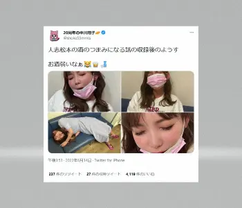 中川は「人志松本の酒のつまみになる話の収録後のようす」と投稿。フジテレビの人気番組『人志松本の酒のツマミになる話』の収録後に撮影したと思われる画像を4枚掲載した。番組はお酒を飲みながら語り合うトークバラエティーで、中川はどれも、お酒に酔っぱらって顔を赤らめたものや、ソファーに崩れ落ちるように寝ている姿など、普段は見せない素顔を公開。「お酒弱いなぁ」とつぶやいた。