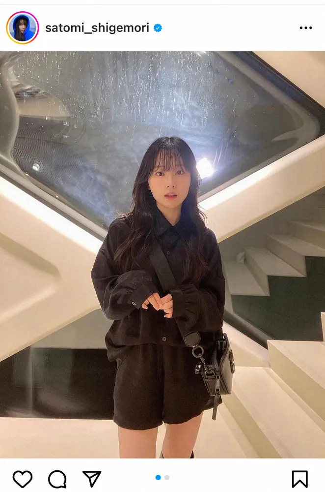 「前髪ふにゃふにゃ重盛。雨の日は何回アイロンしてもスプレーしても、本当外出て15秒後にはフワッフワ(笑)ストレートかけてみようかな」とつづり、全身を黒で統一したショートパンツコーデを披露した。