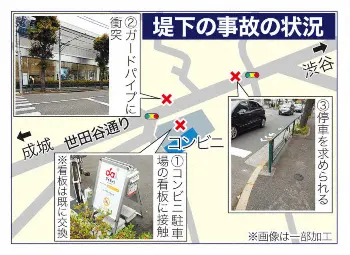 捜査関係者によると、堤下は14日午後2時15分ごろ、世田谷区上用賀のコンビニ駐車場を車で出る際に、レンタル自転車の看板と接触。その直後、駐車場から片側1車線の通りに出て近くのガードパイプにも衝突した。2カ所の距離はわずか20メートルほどだった。