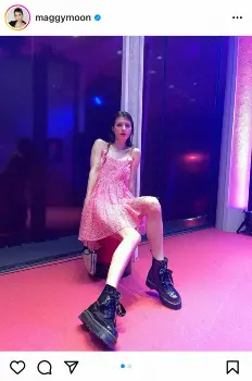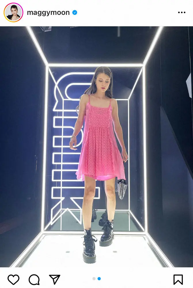 マギーは「買ってから、ずっと着るタイミングをみてたスリップドレスをやっと着れた日」とピンクのスリップドレスに黒のブーツを履いたセクシーショットを投稿した。