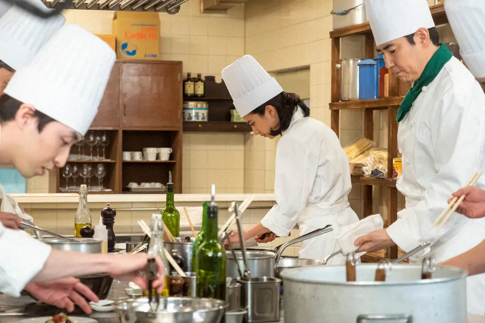 連続テレビ小説「ちむどんどん」第51話。厨房にて。二ツ橋(高嶋政伸・右)に見守られ修業を続ける暢子(黒島結菜)(C)NHK