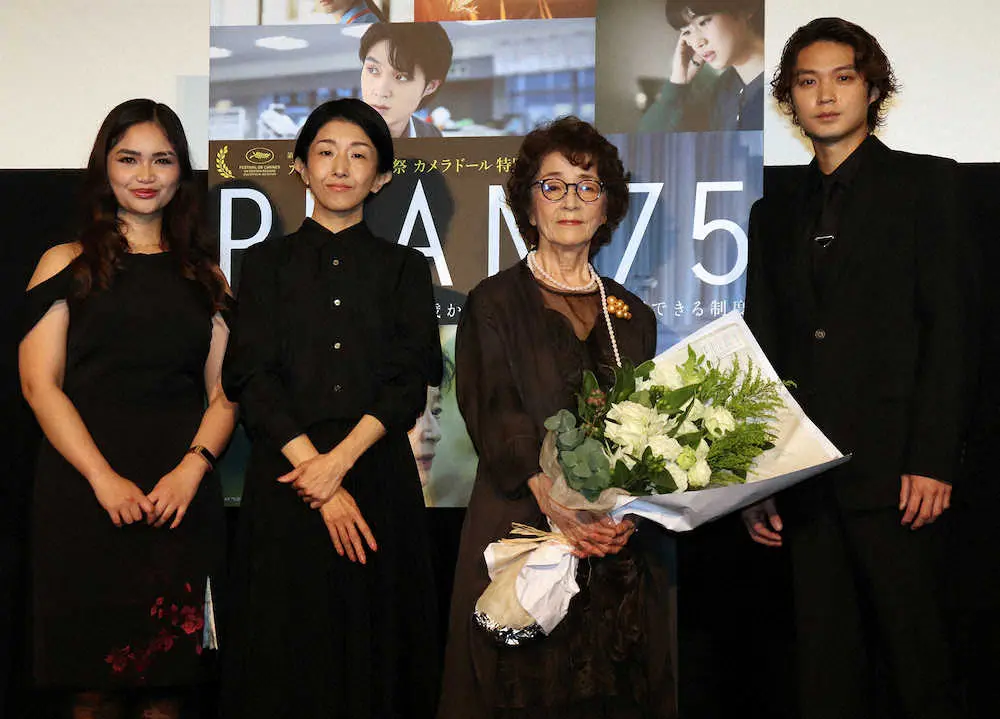 第75回カンヌ国際映画祭のカメラドール(新人監督賞)でスペシャルメンション(特別表彰)を贈られた「PLAN75」の公開記念舞台あいさつが18日、都内で行われ、早川千絵監督(45)、主演の倍賞千恵子(80)らが出席した。