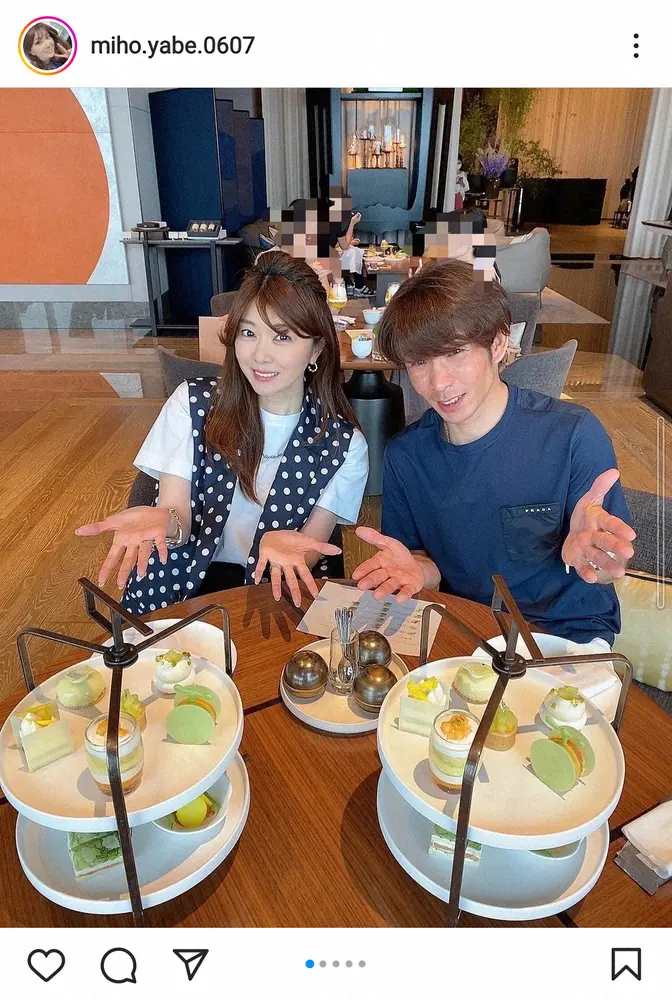 タレントの矢部美穂(45)が21日、自身のインスタグラムを更新。先月29日に結婚を発表した川崎競馬所属の山林堂信彦騎手(43)とアフタヌーンティーを楽しむショットを披露した。