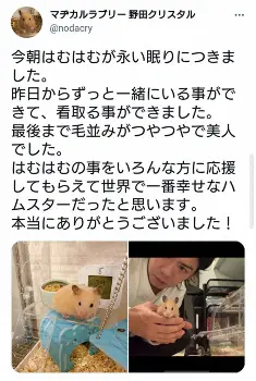 「マヂカルラブリー」の野田クリスタル Photo by スポニチ 野田クリスタル 最愛のペット“はむはむ”との別れを報告 最期看取る「最… ギャラリーで見る この記事のフォト 2022年06月23日の画像一覧 もっと見る 2022年06月23日の画像をもっと見る
