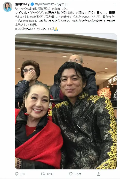 マイケルダンスパフォーマーマサキインスタグラム(@mdp.masaki_staff)から マイケルダンサー・MDP Masakiさん死去 39歳 ダム湖で溺れかけた教え子… ギャラリーで見る この記事のフォト 2022年06月24日の画像一覧 もっと見る 2022年06月24日の画像をもっと見る