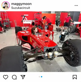 B級ライセンスを取得するほど、車好きとして知られるマギー。この日は「F-1を眺めていたら、乗る?ってオーナーさんが言ってくださり。乗り込んでみました」と真っ赤なフェラーリのF-1マシンに乗り込み、笑顔を見せる自身のショットをアップした。