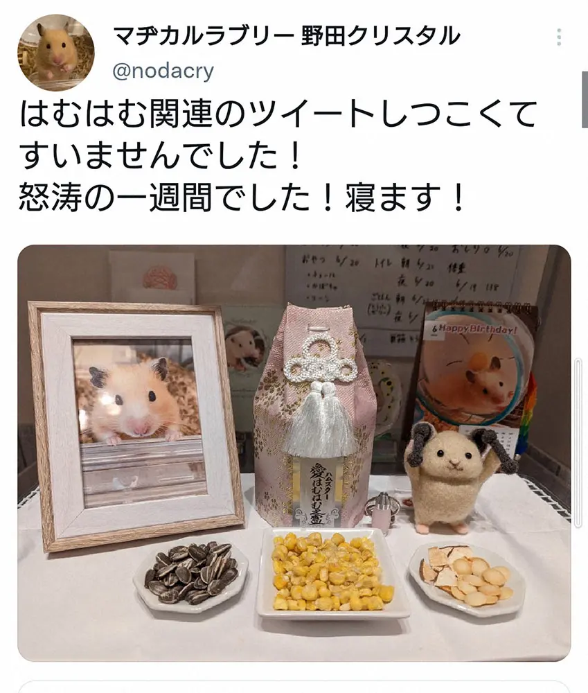 【公式】スーパー野田ゲーWORLD公式ツイッター(@nodaparty)から 野田クリスタル“最愛の家族”はむはむの死から3日で「体重5kgも落ちてた」… ギャラリーで見る この記事のフォト 2022年06月26日の画像一覧 もっと見る 2022年06月26日の画像をもっと見る