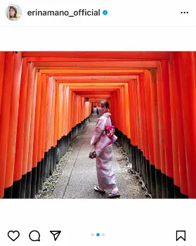 ハッシュタグで「#いつかの休日」「#京都」「#着物レンタル」「#伏見稲荷大社」「#Fushimiinaritaisha」「#きつねうどん」「#岳カメラ」と添え、夫の柴崎との京都旅行だったことを明かし、「久しぶりにハッシュタグいっぱい!笑 ※撮影の時だけマスク外しました」と記した。