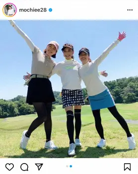 「ある日、初めての組み合わせ!事務所の神田愛花ちゃんと潮田玲子ちゃんと+メイクさんとのゴルフ」とつづり、ミニスカゴルフウエア姿で寄り添う仲睦まじい3ショットを公開した。