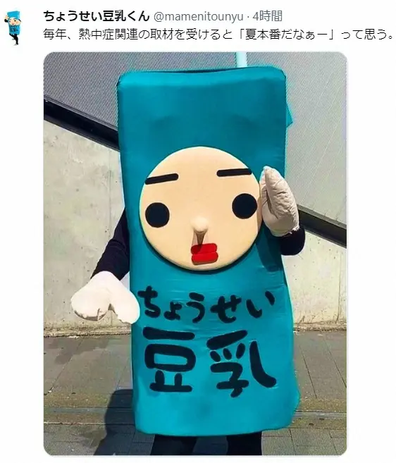 番組を見た視聴者は「こんな猛暑の中での活動…無理しないで」「仕事早めに切り上げて」「着ぐるみは地獄」「ブラック 普通に笑えない」とネットに書き込み。これを受けちょうせい豆乳くんは、公式ツイッターに「めざまし8をご覧になった方へ。豆乳くんは豆乳協会の公認は受けていますが、活動は全て自主的に行なっています。やらされているわけではないので、ご理解ください」と呼びかけた。