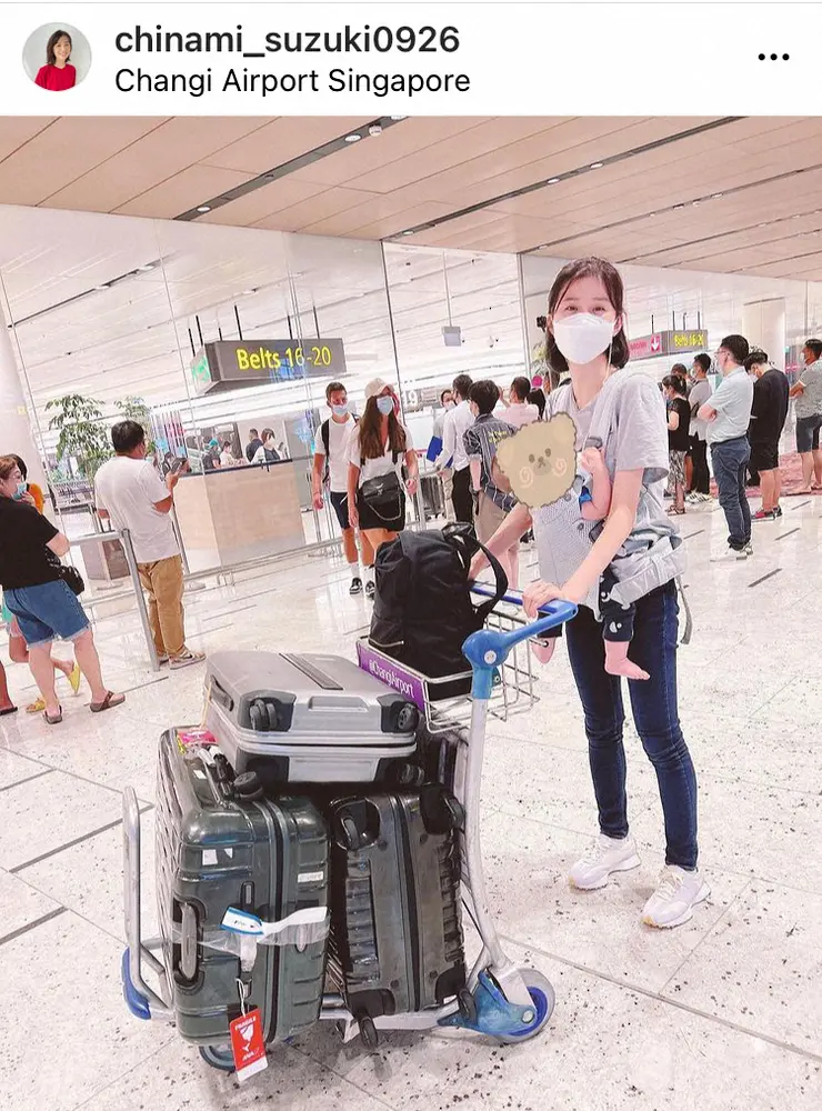 「Hello Singapore」とつづり、昨年9月誕生の第1子を抱っこし、大きな荷物を持つ自身のショットを公開。「シンガポールに到着しましたー!」とシンガポール・チャンギ空港への到着を明かし「私の人生の新しい旅がスタートです。明日からYouTubeの投稿も再会します」とつづった。