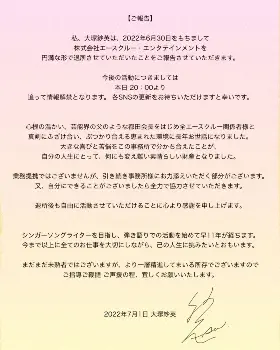 大塚は「ご報告」として直筆サイン入りの文書を発表。「私、大塚紗英は、2022年6月30日をもちまして株式会社エースクルー・エンタテインメントを円満な形で退所させていただいたことをご報告させていただきます」と報告。今後については「本日20:00より追って情報解禁となります。各SNSの更新をお待ちいただけますと幸いです」とした。