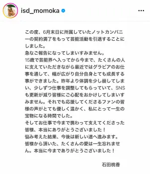 石田はSNSに文書を投稿。「この度、6月末日に所属していたノットカンパニ一の契約満了をもって芸能活動を引退することにしました」と報告した。