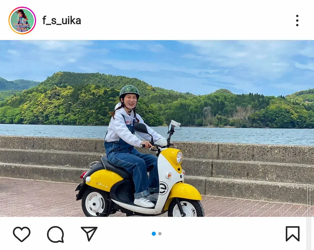 ウイカは「ロケ大好き!!初めて原付乗りました 免許取ってて良かったー!」とつづり、海沿いで原付を運転しながら笑顔を見せるショットを添えた。