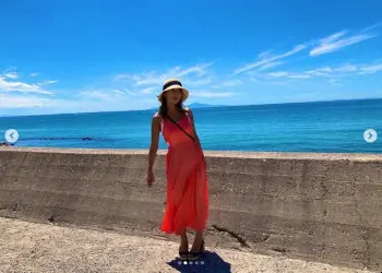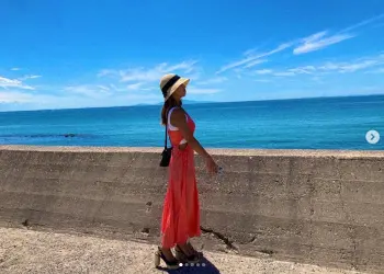 「あっつい。めちゃ焼ける 今日のホテルのサウナは100度超えてて、海見ながら外気浴できて、えーもう最高やーん て感じでした」などとつづり、青空の下、海をバックにした麦わら帽子、ノースリーブのサマーワンピース姿の写真をアップした。