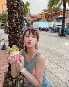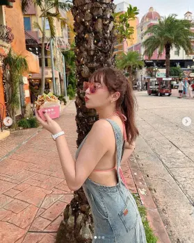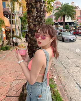 「東京帰ってきた 沖縄で沢山写真撮ったから載せさせて 笑 人生で初めて行ったアメリカンビレッジ」などとつづり、アメリカンビレッジでのデニムのオーバーオール姿の写真をアップした。