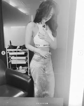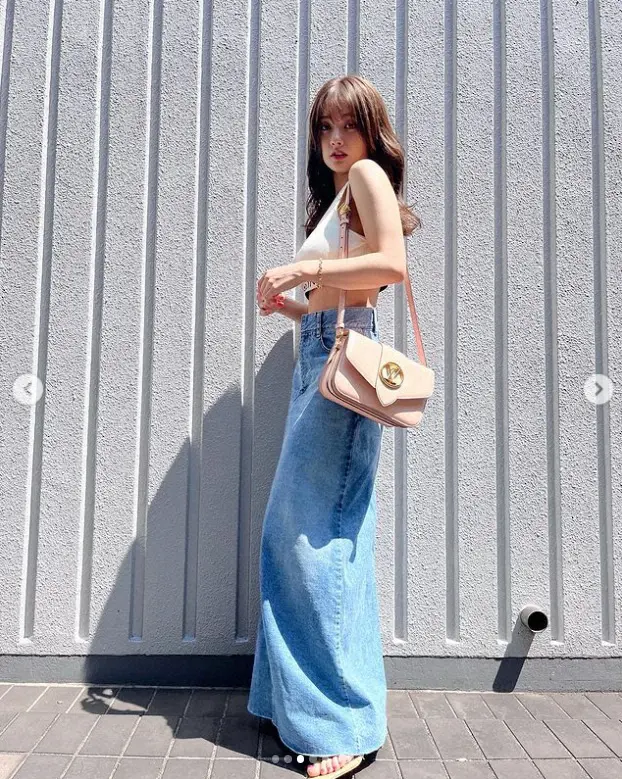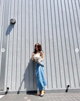 「あ つ い です!」とつづり、クビレを露出させたタンクトップ、デニムのロングスカート姿の写真をアップした。