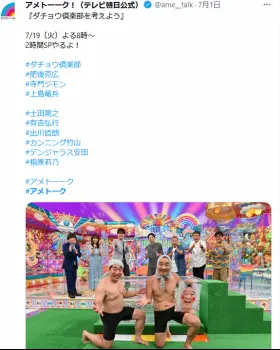 特別番組は「ダチョウ倶楽部を考えよう」をテーマにした2時間スペシャルで、出演者は「ダチョウ倶楽部」の肥後克広と寺門ジモンのほか、上島竜兵さん(享年61)と親交の深い土田晃之、有吉弘行、出川哲朗、カンニング竹山、お笑いコンビ「デンジャラス」の安田和博、指原莉乃らが名を連ねた。