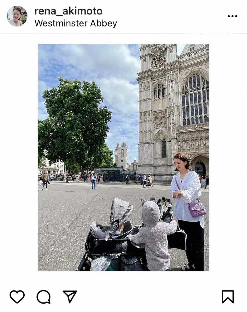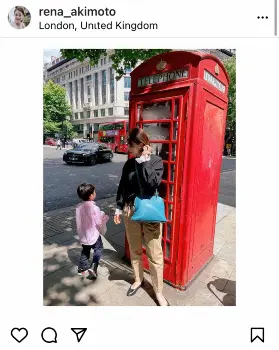 続く投稿では「まだ少し観光気分」と赤の電話ボックスに、奥には2階建てのロンドンバスが写り込む長男との母子ショットをアップ。「長男はロンドンバスに大興奮で、必ず2階席に私の手を引っ張って行きます」とつづり、ハッシュタグでも「#ロンドン生活」「#双子ママ」「#3兄弟ママ」などと添えた。