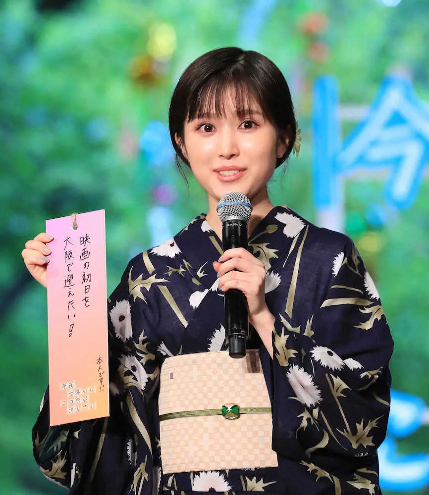 浴衣姿で短冊に「映画の初日を大阪で迎えたい」と願い事をしたためた。福本と道枝はともに大阪出身で「大阪でやりたいなとずっと言っていた。ここで言ったらかなえてくれるんじゃないかなと思って発表しました」と茶目っ気たっぷりに語った。