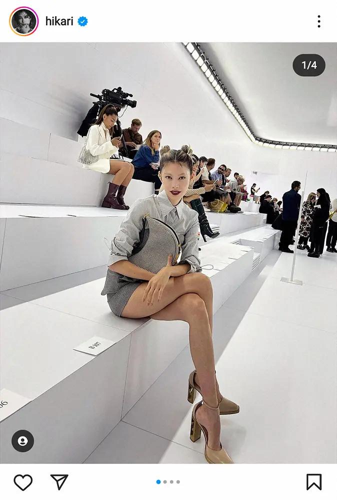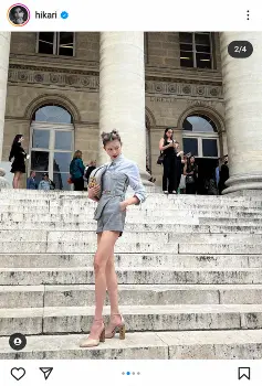 両サイドをお団子にしたヘアで、グレーのシャツ、ミニ丈のボトムス、ハイヒールのパンプスで脚を組んで座る姿や、階段で立ち姿でポーズをとっている写真で、美脚ぶりが見て取れるものになっている。