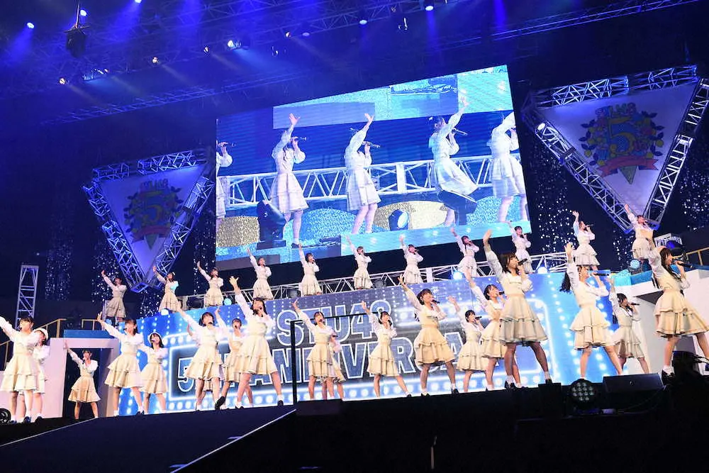 STU48が10日、広島グリーンアリーナでグループ結成5周年コンサートを開催した。5月3日に開催予定も、直前に出演メンバーに新型コロナウイルス陽性者が出て、延期されていた。活動拠点の瀬戸内地域で最大のアリーナという悲願の舞台に、メンバー全37人で立ち、記念日を祝った。