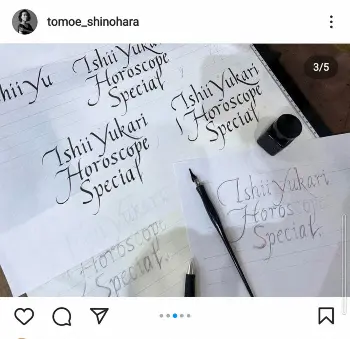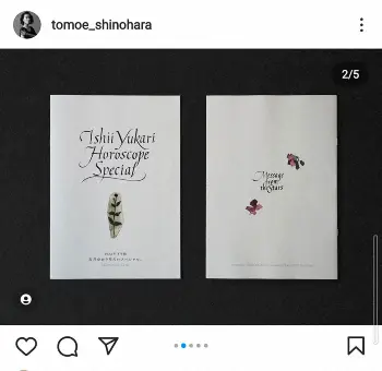 篠原はmadame FIGARO japonの8月号「占いで整える2022」袋綴じ付録のデザインしたと説明し、「カリグラフィーは、近年私が文字のデザインの勉強のために始めた新しい習い事なのですが、作品にするのは初めて。鉛筆の下書きを参考に何度も書き直し…先生にもたくさんアドバイスいただきました。花の挿絵は紙凹版(かみおうはん)という版画で」と説明。