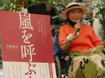 吉崎道代さん ケガに負けず自伝アピール 腰骨を圧迫骨折も車椅子で登場「とりわけ女性の方に」