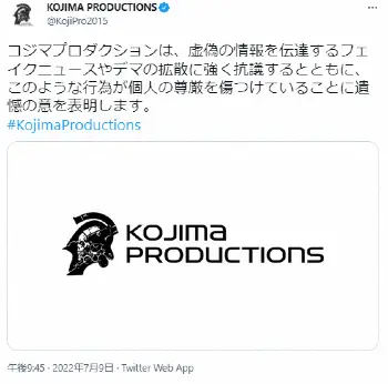 日本語のツイッターで「コジマプロダクションは、虚偽の情報を伝達するフェイクニュースやデマの拡散に強く抗議するとともに、このような行為が個人の尊厳を傷つけていることに遺憾の意を表明します」と投稿。さらに英語版のアカウントでは「虚偽の情報を伝える偽のニュースや噂の拡散を強く非難します。私たちはそのような名誉毀損を容認せず、場合によっては法的措置を取ることを検討します」と記載した。