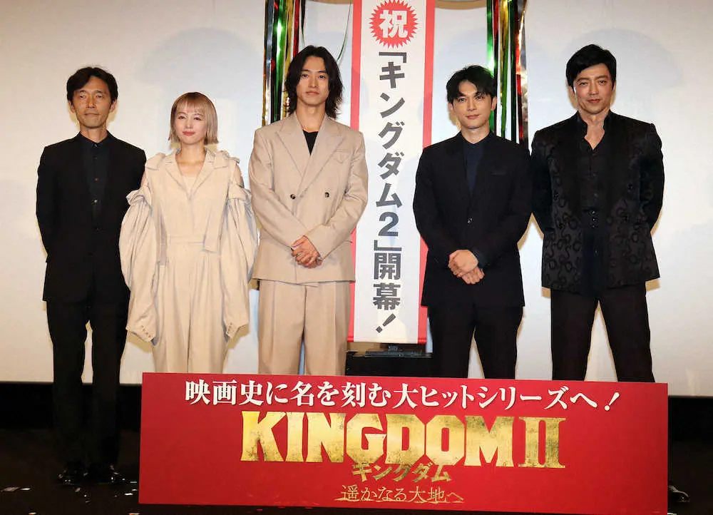 俳優の山崎賢人(27)が15日、都内で主演映画「キングダム2 遥かなる大地へ」(監督佐藤信介)の初日舞台あいさつを共演の吉沢亮(28)、清野菜名(27)らと行った。