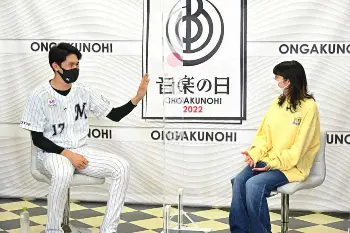 あいみょんから、4月10日のオリックス戦で完全試合を達成した試合を「観てました」と自宅のテレビで観戦していたことを伝えられた佐々木朗は「本当ですか?ありがとうございます」と表情を崩した。