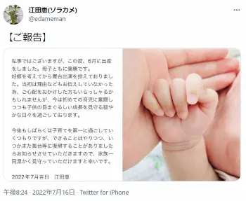 江田も自身のツイッターを更新し、文書の画像で「お世話になっている皆様へ」とし「私事ではございますが、この度、6月に出産をしました」と報告し「母子ともに健康です」とした。