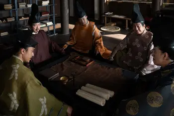大河ドラマ「鎌倉殿の13人」第27話。文官4人に“5人衆”を持ち掛ける北条義時(小栗旬・左端)(C)NHK
