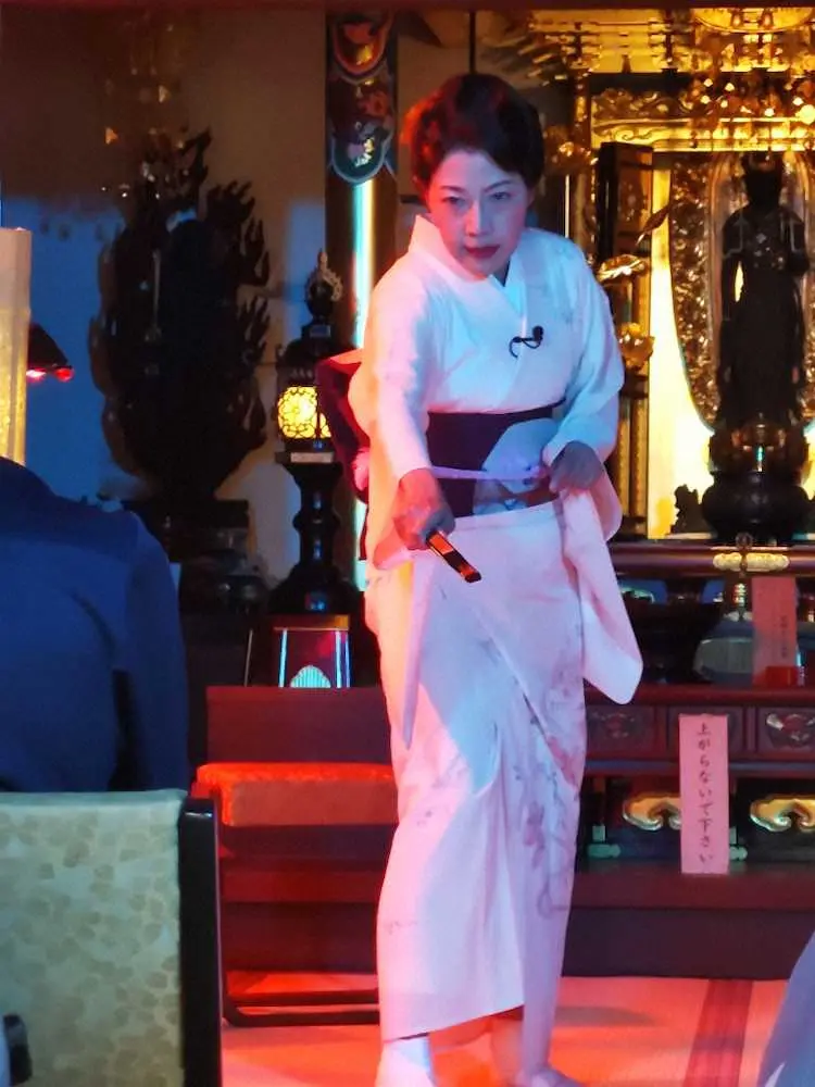女優まつむら眞弓(年齢非公表)が16日、京都市中京区の新選組ゆかりの寺として知られる壬生寺塔頭中院で朗読劇「新選組異聞 怪談あかずの井戸」を上演した。同寺では毎年この日に新選組隊士や幕末の志士たちの合同慰霊祭が営まれており、朗読会も盛況だった。