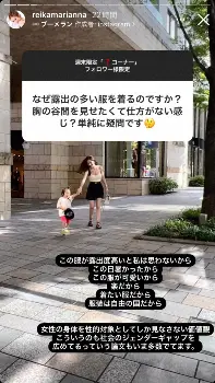 フォロワーからの質問に答える企画をストーリーズ機能で実施。「なぜ露出の多い服を着るのですか?胸の谷間を見せたくて仕方がない感じ?単純に疑問です」という質問に対して、宮崎さんは「この服が露出度高いと私は思わないから、この日暑かったから、この服が可愛いから、楽だから、着たい服だから、服装は自由の国だから」と説明。あわせて、キャミソールにショートパンツを合わせたスタイルで子供と出かける様子を添えた。