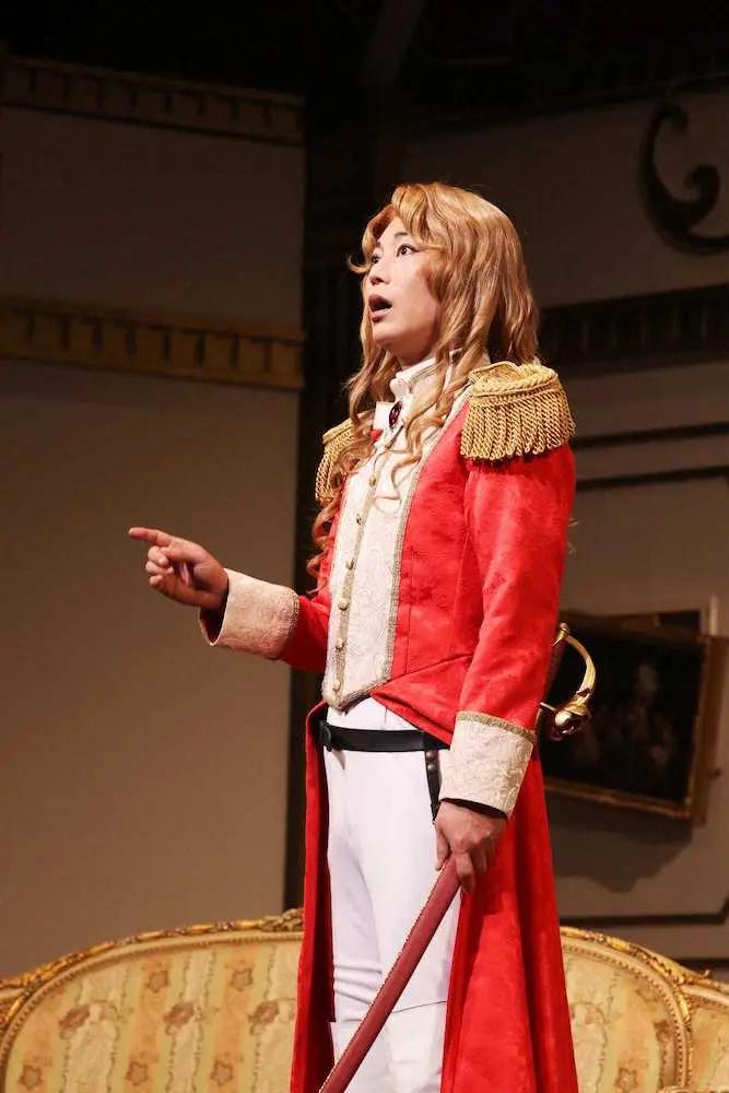 1幕の芝居「ケイト・シモンの舞踏会」では歌手を目指す青年にふんし、フランス革命直前のパリにタイムスリップ。「ベルサイユのばら」のオスカル風衣装なども披露し客席をわかせた。