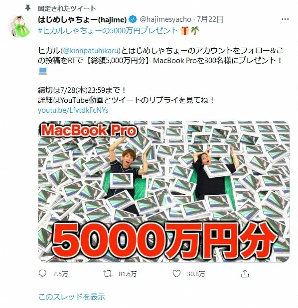 はじめしゃちょーのツイッターより(@hajimesyacho) はじめしゃちょー&ヒカル5000万の大盤振る舞い!高級PC300台プレゼント“あ… ギャラリーで見る この記事のフォト 2022年07月24日の画像一覧 もっと見る 2022年07月24日の画像をもっと見る