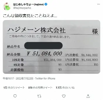 また、はじめはツイッターを更新し「こんな領収書見たことねえよ…」と画像を添付。そこには「5108万4000円」と記されている。なお、応募方法は、はじめとヒカルのツイッターをフォロー&該当のツイートをRTすること。28日まで受け付けるといい、24日15時時点で約80万RTの大盛り上がりとなっている。