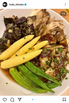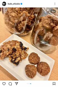 工藤は「蒸し蒸し暑いですね」として「夏野菜の煮浸し。冷たくても美味しくいただけますよね」とつづり、茄子の煮浸しといなり寿司や、キノコ、ベビーコーン、オクラなどをアレンジした一品を紹介。さらに、「オーツ麦とレーズンのグラノーラに、きな粉とふすまのボーロ」も披露した。