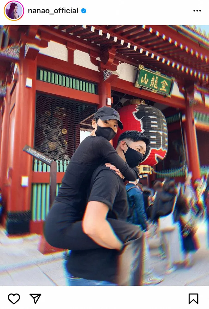 菜々緒は「家族で浅草寺 兄におんぶしてもらうと2mになります」とつづり、兄とのツーショットを公開。雷門の前でおぶられ笑顔の姿を公開した。
