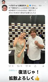 へずまりゅうは木下さんとのツーショット写真を投稿。「木下優樹菜ちゃんADHDの告白偉いよ」と称え「ADHDがバカなのは当たり前だけど それと付き合う勇気が必要なんだよ」と持論を展開した。